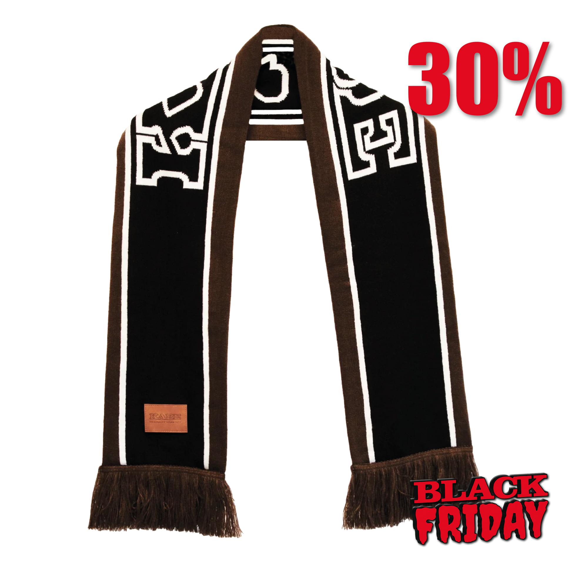 Specialtillverkad halsduk, matchande till mössa med invävt motiv och läderpatch.